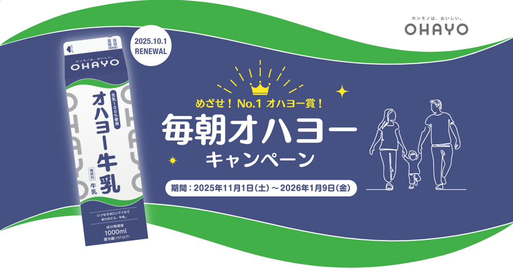 期間中、オハヨー牛乳1000mlの購入レシートを撮影し、ポイントを貯めて応募すると、ステキな賞品が当たります。